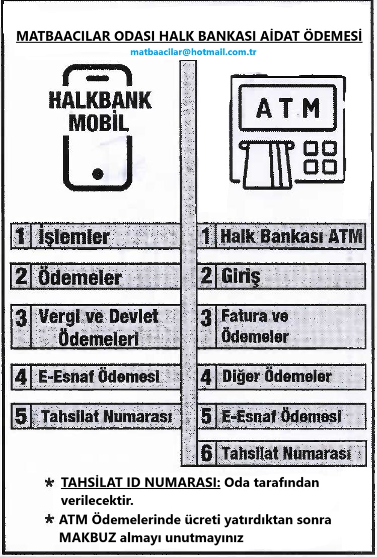 2026 YILINDA AIDAT ODEME SISTEMI DEGISTIRILMISTIR.IBAN NO ILE ODEME BAKANLIK TARAFINDAN KALDIRILMISTIR. 2026 YILINDA AIDAT ODEMESI YAPABILMEK ICIN ONCE ODA MERKEZINI ARAYARAK.BORCUNUZU ÖĞRENMENİZİ VE ODEME ID NUMARASI ALARAK BU NUMARA ILE HALKBANKASINDAN (ATM,SUBE VE TELEFON UYGULAMASI) UZERINDEN MECBURI OLARAK YAPILACAKTIR. BILGILERINIZE SUNARIZ.